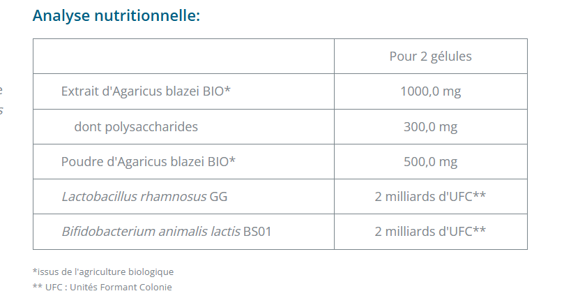 Extrait de sporophore d'Agaricus blazei (Agaricus subrufescens) BIO* (sulfites), poudre de sporophore d'Agaricus blazei (Agaricus subrufescens) BIO* (sulfites), tunique d’origine végétale : hydroxypropylméthylcellulose, souches de microbiote microencapsulées: Lactobacillus rhamnosus GG et Bifidobacterium animalis lactis BS01.