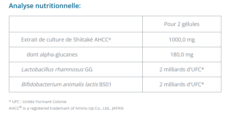 Extrait du Shiitaké (Lentinula edodes) AHCC®, tunique d’origine végétale : hydroxypropylméthylcellulose, souches de microbiote microencapsulées : Lactobacillus rhamnosus GG et Bifidobacterium animalis lactis BS01.